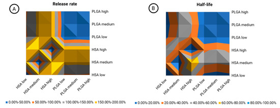 The blue area in the top right quarter of both graphs (Figure 6A,B) shows a comparison of PLGA nanoparticles at three different dose levels. Expectedly, the average variation in this area was 3.87% in the release rate and 2.02% in the carrier half-life, as indicated by the color (0–50.00%). Hence, the model parameters did not respond to dose-related changes that do not affect the carrier properties. As we learned from the physicochemical and in vitro characterization of HSA-stabilized rifabutin nanoparticles, for these particles, the dose strength likely affects the size distribution and release behavior of the formulation, too. Hence, a similar comparison between the dose strengths of HSA-stabilized nanoparticles led to much higher average differences of 128.30% (release rate,/Figure 6A, bottom left quarter) and 31.11% (half-life/Figure 6B, bottom left quarter). The average differences between PLGA and HSA-stabilized nanoparticles were 152.46% (release rate/Figure 6A, top left and bottom right quarter) and 32.50% (half-life/Figure 6B, top left and bottom right quarter), respectively. Overall, it is not surprising that the carrier half-life was less affected. The disassembly of HSA nanoparticles into the albumin-bound molecules will potentially occur much faster in vivo due to the distribution and dilution of the carrier. As compared to the NCA, inequivalence was detected much more sensitively. Moreover, the reasons for biopharmaceutical inequivalence were reflected by the pharmacokinetic parameters indicating improved robustness against population-dependent influences.