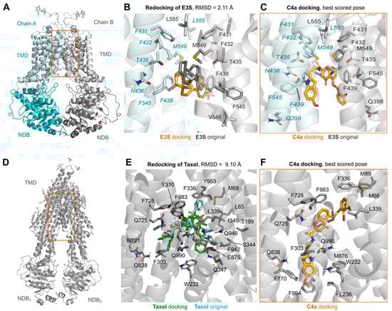 In silico interaction of C4a with ABCG2 and P-gp. Molecular docking analysis in human ABCG2 (PDB: 6HCO) (A–C) and P-gp (PDB: 6QEX) (D–F). Amino acid residues are colored according to the atom involved in the interaction (carbon, light grey (chain A of ABCG2 and P-gp) and pale blue (chain B of ABCG2); oxygen, red; nitrogen, blue). (A,D) display an overview of the transporter structure, highlighting the position of the docking pose box as an orange square. The original conformation of substrates estrone-3-sulfate (E3S) for ABCG2 display small conformational changes when compared to the highest scored docking pose from molecular docking (B), while redocking of taxol within P-gp is much more expressive (E). Best scored pose of the interaction of C4a with ABCG2 (C) and P-gp (F).