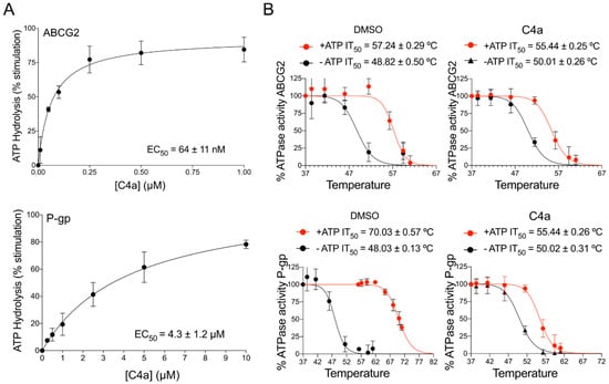 To further investigate the interaction of C4a with ABCG2 and P-gp using a membrane-based approach, a thermal stability assay was performed. This experiment was performed in two conditions: Absence versus presence of ATP. As shown in Figure 3B, C4a triggered a mild effect on ABCG2, since the IT50 (temperature that reduces 50% of the ATPase activity) values in presence or absence of C4a were very similar. In contrast, C4a stabilized the inward-open conformation of P-gp, resulting in the loss of ATP-induced dimerization of NBDs and consequently preventing thermostabilization (Figure 3B).