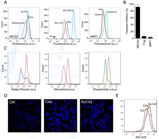 To confirm the ABCG2 functional inhibition, the same cell-based approach was used using different substrates, including bodipy-prazosin, mitoxantrone, pheophorbide-a and hoechst 33342. The transport inhibition of bodipy-prazosin, mitoxantrone and pheophorbide-a was investigated by flow cytometry, while the transport inhibition of hoechst 33342 was studied by confocal microscopy. As shown in Figure 4C,D, C4a at 10 µM inhibited the efflux of all these chemically unrelated fluorescent ABCG2 substrates. Additionally, to endorse the inhibition feature of C4a on ABCG2, the 5D3 shift assay was performed. This assay consists of the use of the anti-ABCG2 conformational antibody clone 5D3 that recognizes an extracellular loop of this protein. The results demonstrated that C4a increased the binding of 5D3, such as the reference inhibitor Ko143 (Figure 4E).