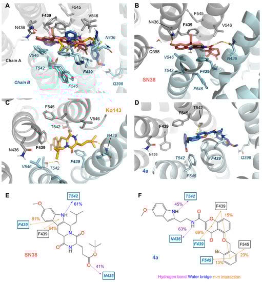 Molecular dynamic simulations: (A) Representative snapshots of the last frames for molecular dynamics simulations highlight the superposition of all poses. (B) SN38 substrate—red, (C) Ko143 inhibitor—orange and (D) C4a-blue. ABCG2 amino acid residues are colored according to the atom involved in the interaction (carbon, light grey (chain A) and pale blue (chain B); oxygen, red; nitrogen, blue). Hydrogen bond interactions and water bridges are represented by dashed yellow lines. (E,F) Two-dimensional representation of the interaction frequency for SN38 (E) and C4a (F) observed along with the molecular dynamics simulations. Each number represents the mean of at least five independent simulations (5 × 200 ns).