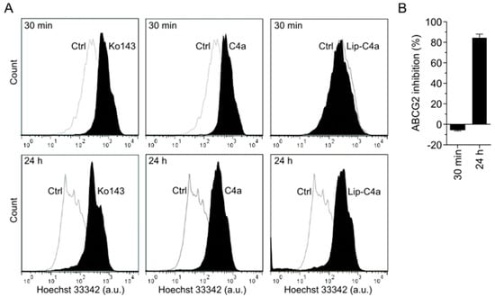 In vitro studies of ABCG2 inhibition using Lip-C4a (C4a loaded into liposomes composed of DSPC/DOPE). Cell-based transport assay using stably transfected cell lines overexpressing ABCG2. Hoechst 33342 (3 µM) and Ko143 (1 µM) were used as substrate and reference inhibitor, respectively. C4a or Lip-C4a were used at 10 µM. (A) Representative histograms were obtained by flow cytometry (30 min of incubation with inhibitor-upper part; 24 h of incubation with inhibitor-bottom part). (B) Data of mean ± SD of three independent experiments.