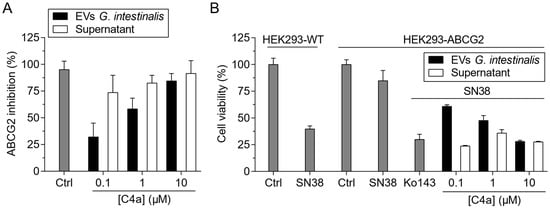 In vitro studies of ABCG2 inhibition using EVs G. intestinalis-C4a (C4a loaded into EVs from G. intestinalis). Cell-based transport assay using stably transfected cell lines overexpressing ABCG2. Hoechst 33342 (3 µM) and Ko143 (1 µM) were used as substrate and reference inhibitor, respectively. (A) C4a free in the supernatant or EVs G. intestinalis-C4a were tested at 0.1, 1 and 10 µM. Data of mean ± SD of three independent experiments. (B) Cell viability assay on wild-type cells (HEK293-WT) and HEK293-ABCG2 cells. SN38 (10 nM) was used as chemotherapeutic drug transported by ABCG2. Ko143 (1 µM) was used as a reference inhibitor. Co-treatment of SN38 with either C4a free in the supernatant or EVs G. intestinalis-C4a were tested at 0.1, 1 and 10 µM. Data of mean ± SD of three independent experiments.
