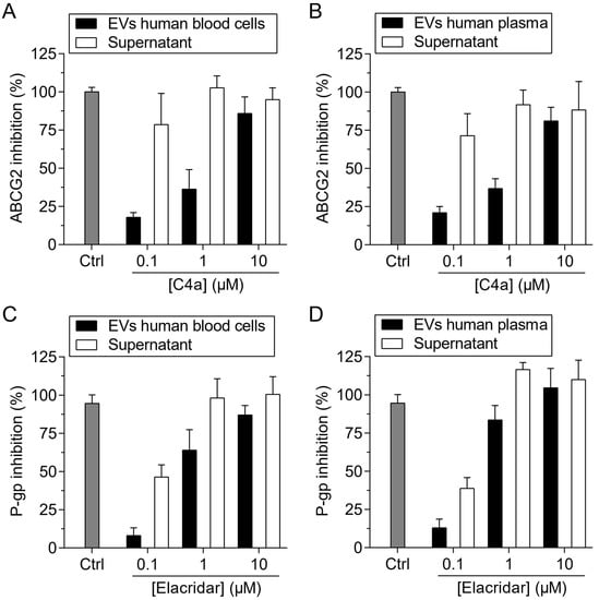In vitro studies of ABCG2 and P-gp inhibition using EVs human-C4a (C4a loaded into EVs from blood human cells and plasma). Cell-based transport assay using stably transfected cell lines overexpressing ABCG2 and P-gp. Data of mean ± SD of three independent experiments. For ABCG2, hoechst 33342 (5 µM) and C4a (1 µM) were used as substrate and reference inhibitor, respectively. (A) C4a free in the supernatant or EVs human blood cells-C4a were tested at 0.1, 1 and 10 µM. (B) C4a free in the supernatant or EVs human plasma-C4a were tested at 0.1, 1 and 10 µM. For P-gp, rhodamine 123 (10 µM) and elacridar (1 µM) were used as substrate and reference inhibitor, respectively. (C) Elacridar free in the supernatant or EVs human blood cells–elacridar were tested at 0.1, 1 and 10 µM. (D) Elacridar free in the supernatant or EVs human plasma–elacridar were tested at 0.1, 1 and 10 µM.