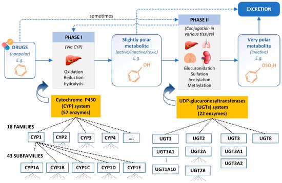 Drug metabolism refers to the biochemical processes by which the body modifies and eliminates drugs and other foreign substances. The body metabolizes drugs to either activate or inactivate them, and this can influence their therapeutic effects and potential for toxicity. The process of drug metabolism reactions can be classified into two main phases based on their chemical nature [,] (Figure 2). Phase I metabolism typically involves the oxidation, reduction, or hydrolysis of the drug, which can produce metabolites that are either inactive, active, or toxic. This process is primarily carried out by a family of enzymes called cytochrome P450 (CYP) enzymes. Phase II metabolism involves the conjugation of the modified drug with another molecule, such as glucuronic acid, sulfate, or amino acids. This process increases the water solubility of the drug and makes it easier to excrete. Phase II reactions are typically carried out by a variety of enzymes, including UDP-glucuronosyltransferases (UGTs), sulfotransferases, and glutathione S-transferases (GSTs). It is crucial to keep in mind that these reactions do not have to happen in order; they could even occur in reverse, in phase II, then in phase I, or as a single reaction []. The rate and extent of drug metabolism can vary greatly depending on the specific drug and individual factors such as genetics, sex, age, and disease status. Some drugs may be metabolized very quickly, while others may be metabolized very slowly, leading to the accumulation of potentially toxic levels of the drug in the body.
