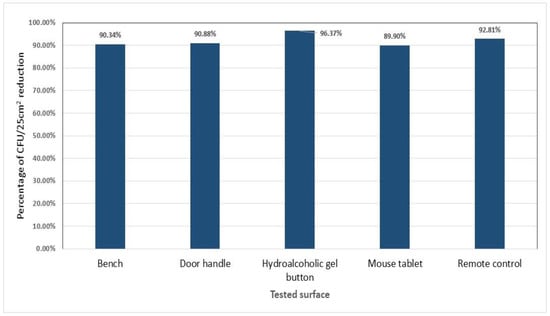 Results are expressed in percentages of CFU/25 cm2 reduction per type of surface using the following formula:
