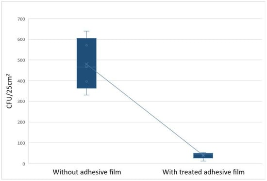The level of contamination of noncovered surfaces reached 2–3 logs at baseline. The highest colony count of surfaces without the treated polyethylene film was detected on the remote control (640 CFU/25 cm2), followed by the door handle (570 CFU/25 cm2), the bench (446 CFU/25 cm2), mouse tablet (396 CFU/2 cm2), and finally the hydro-alcoholic gel button (331 CFU/25 cm2). The results show that the average percentage of CFU/25 cm2 reduction in the levels of contamination between the surfaces covered with treated polyethylene adhesive film compared with noncovered surfaces exceeded 90% (p = 0.001). The antimicrobial effect was sustainable throughout the duration of the experiment (Figure 2). Details of the tests are shown in Supplementary Table S1.