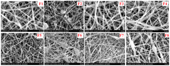 Scanning electron micrographs of developed scaffold formulations F1–F8.