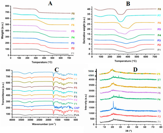 The thermal stability of the formulations was assessed using TGA and DTA. Their respective curves, as shown in Figure 2A,B, indicated the percentage of weight loss as a function of temperature. The results showed the F1 formulation containing PVA and PCL underwent thermal decomposition in 4 steps. The first weight-loss step occurred between 300 and 368 °C, and this was attributed to the loss of the water molecules immobilized within the polymer matrix [50]. The TGA profiles for F2 and F4 showed 2 weight-loss steps. The second weight-loss step was attributed to the removal of the water chemically bound to the functional groups in PVA and PCL, which were not removed during the first step [48]. The metronidazole-loaded formulations (F5 and F6) showed a single weight-loss step, from 295 to 466 °C, which was possibly due to the degradation of the metronidazole [51]. These profiles were corroborated by the derivative curves (DTA profiles) shown in Figure 4. The formulations displayed good thermal stability up to 300 °C. From 0 to 300 °C, F1 only recorded a weight loss of about 1%. F5, which contained metronidazole, recorded a 10% weight reduction within the same temperature range. The additional weight loss could be attributed to the presence of metronidazole [48]. In contrast to F6, which also contained metronidazole, the weight loss recorded within the same temperature range was only 4%. The lower weight loss could be attributed to the addition of sodium cocoamphoacetate to the F6 formulation, which could have enhanced its thermal stability. When comparing the profiles of F2, F3 and F4, weight losses of 4%, 8%, and 7% were observed. The lower weight losses, as compared to F5, were also attributed to the addition of sodium cocoamphoacetate in these formulations. The TGA and DTA profiles of the electrospun formulations containing Lactobacillus spp. (F7 and F8) showed very similar trends with a single weight-loss step observed from around 300 to 350 °C.