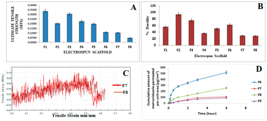 (A) Ultimate tensile strength of electrospun scaffolds, (B) Ductility of electrospun scaffolds, (C) Tensile strain vs. tensile stress of electrospun fibers F7 and F8, and (D) Cumulative Amount of metronidazole permeated per unit (µg/cm2) vs. time in hours.