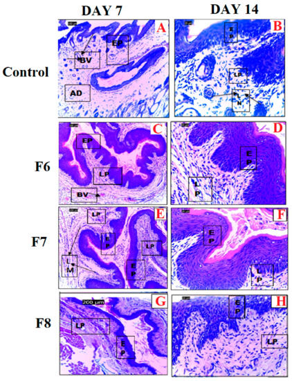 As shown in Figure 4A,B, the histological section of the vaginal tissue of the control group showed the normal architecture of vaginal tissue, with the lamina propria (LP) containing blood vessels (BVs) and lymphocytes (LMs) with non-cornified stratified squamous epithelium (EP). Figure 4B,C shows tissues treated with F6, which had normal architecture with lamina propria (LP) containing blood vessels (BVs) and lymphocytes (LMs) with non-cornified stratified squamous epithelium (EP). The adventitia (AD) blood vessels (BVs) as well as the lamina propria (LP) containing blood vessels (BVs) and lymphocytes (LMs) with cornified and hypertrophied stratified squamous epithelium (EP) were also observed. Figure 4D,E shows tissues treated with F7, and these were a slightly abnormal epithelium with distortions on the stratum corneum layer, as indicated by the arrow. The lamina propria (LP) containing blood vessels (BVs) and hypertrophied epithelium (EP) showed estrogen-induced stratification and cornification. The histological slides showed a moderate atrophic lamina propria (LP) and a very thin cornification of the stratum with distortions and a hypertrophied epithelium (EP), as well as estrogen-induced stratification and cornification by day 14. A normal lamina propria (LP) containing blood vessels (BVs) and lymphocytes (LMs) with a hypertrophied epithelium (EP) showed estrogen-induced stratification and cornification at 7 days. F8-treated animals showed normal vaginal architecture with a lamina propria (LP) containing blood vessels (BVs) with a non-cornified stratified squamous epithelium (EP) with a permeable layer. At 14 days, the tissues showed lamina propria (LP) containing blood vessels (BVs) and lymphocytes (LMs) with non-cornified, stratified squamous epithelium (EP).