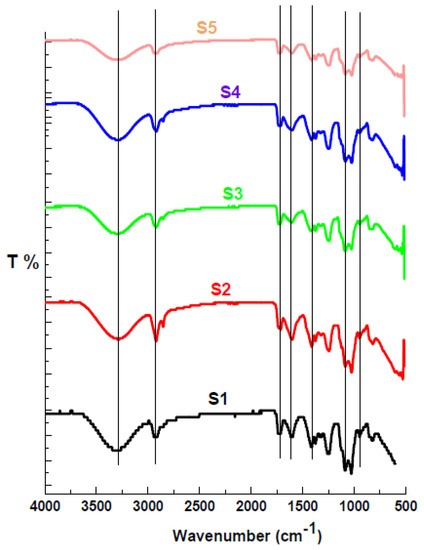 The FT-IR examined all scaffolds to identify their cross-linkers throughout their functional groups [31]. Figure 2 shows the FTIR spectra of MOE/SA/PVA. The broad absorption bands between 3000 and 3700 cm−1 were linked to the stretching vibration of the O–H bond from inter- to intra-molecular hydrogen bonding in PVA and SA [32]. A reduction in the intensity of this absorption of these O–H bands in the scaffolds was observed by increasing the Moringa oleifera leaves extract, probably due to the interaction of the extracted constituent with the pendant hydroxyl groups of the polymer chains. These findings confirm the interaction of the extract components with the SA/PVA matrix. The sharp peak with weak intensity observed between 2800 and 3000 cm−1 can be attributed to the stretching vibration of C–H from alkyl groups. The scaffold’s peak at 1735 cm−1 was due to C=O from residual acetate groups in PVA and ester linkage [33,34]. This confirmed the extract functional groups’ interaction with the SA/PVA matrix. Further, a peak at about 1665 cm−1 corresponded to the hydroxyl bending mode [35]. This band was weakened, indicating the involvement of hydroxyl groups in scaffold formation and supporting the interactions between functional groups. The CH2 scissoring vibrations characteristic of PVA could be seen at 1458 cm−1 [36,37]. The bands at approximately 1033 cm−1 could be attributed to a strong C–O stretching region as a complex band resulting from C-O and C-O-C stretching vibrations. The peak that appeared for a scaffold without extract (S1) at 841 cm−1 corresponding to C−H bending had almost weakened, which provides evidence of the cross-linking between hydroxyl groups of extracted and SA/PVA matrix [38].