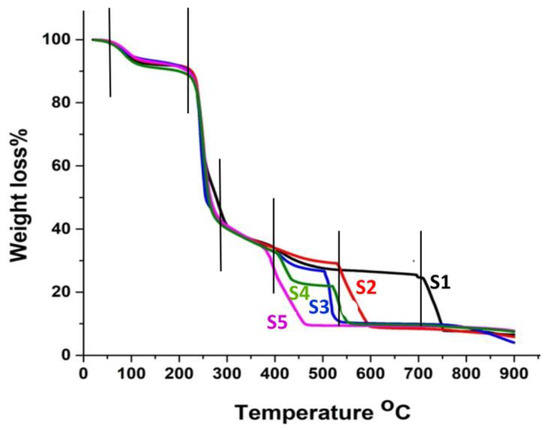 These two steps were comparable for all samples, which referred to the thermal stability of the extracts in the scaffold up to 380 °C and confirmed the interaction between the extracts and the SA/PVA matrix through hydrogen bond formation. The last step was observed at 750, 600, 380, 450 and 460 °C for samples 1, 2, 3, 4 and 5, respectively (around 20% weight loss) because of carbonization [41]. The pure SA/PVA scaffold S1 exhibited a higher thermal stability compared to the scaffolds S2–S5, containing MOE. In more detail, for this step scaffold S1 showed 75% and 90% weight loss at 697 °C and 747 °C, respectively. The scaffolds S2, S3, and S4 forfeited 75% of their weight at 542, 506, and 404 °C and reached 10% residual weight at 593, 530, and 462 °C, respectively, while S5 forfeited 90% of its weight at 450 °C and the residual weight was 10% up to 900 °C. During this stage, weight loss occurred due to the decomposition, degradation, and vaporization of the stable polymer chain that remained.