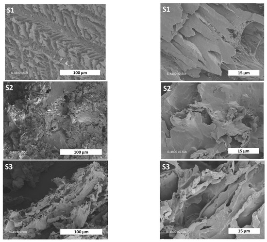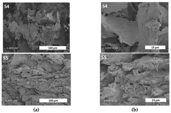 Finally, the morphology of the materials was investigated via scanning electron microscopy (SEM). The SEM images of the materials S1–S5 are given in Figure 5. All materials showed lamellar architectures with interconnected porosity on the micrometric level. All materials showed homogeneous morphologies, suggesting that the components were homogeneous on the micrometric level. The lamellar morphology probably resulted from the freeze-drying process. Similar morphologies have already been observed for related PVA/cellulose composites [42]. It has to be pointed out that no incidence related to the increasing content of the MOE could be detected. The increasing MOE content therefore had no impact on the morphology of the samples.