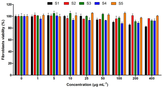 The results presented in Figure 6 show the low toxicity of pure and extract-immobilized SA/PVA scaffolds on human living fibroblasts. At 400 µg/mL, the cell viability values were above 90% for S2, S3, S4 and S5. However, for S1, the pure SA/PVA scaffold, the value was 82 ± 2%. The increase in cell viability can be explained by the beneficial properties of Moringa extract, which was present in increasing amounts in the formulations. These cytotoxicity results indicate the biocompatibility of MOE/SA/PVA.