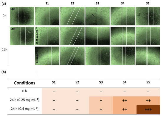 Figure 7. Cell scratch assay on human fibroblasts treated (or not) with different concentrations of pure extract and MOE/SA/PVA and observed at 0 to 24 h after treatment (a). Representative table of the wound-scratch-healing capacity of the different scaffolds when compared with the control (b).