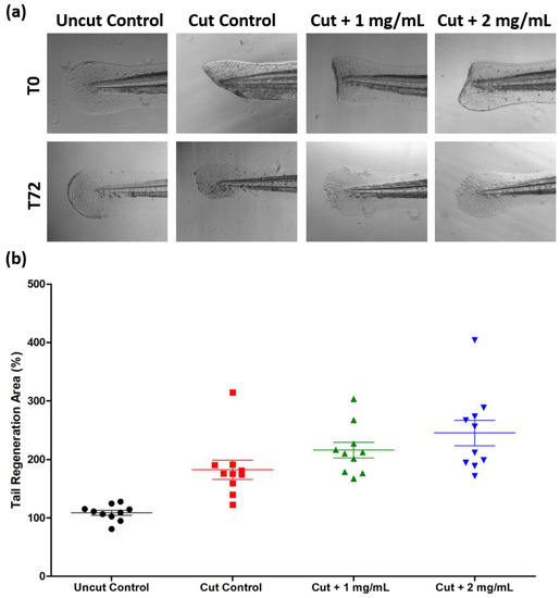 Casper zebrafish embryos were obtained from the lab’s facilities of molecular mechanisms in neurodegenerative dementia (MMDN), Inserm U1198, Montpellier University, Montpellier. Embryos were maintained in Petri dishes with a sufficient amount of water at 28 °C and a 14 h light/10 h dark cycle. At 72 h post fertilization (hpf), the caudal fin was transected (or not) with a sterile scalpel, under anesthesia with 168 µg/mL of Tricaine (ethyl 3-aminobenzoate, Sigma Aldrich, France) in zebrafish water, and imaged using EVOS M5000 microscopy (T0). Embryos were kept in 24-well plates, one embryo per well, with 2 mL of water containing 0 or 1 mg/mL or 2 mg/mL of Moringa oleifera extract immobilized SA/PVA scaffold suspensions (S5). Embryos were observed after 3 days of treatments (T72). The area of the tail of each embryo was calculated using ImageJ software at T0 and T72. The growth percentage in each embryo was calculated as T72/T0 × 100. Results are presented as mean ± SEM. The number of embryos was 10 for each condition.