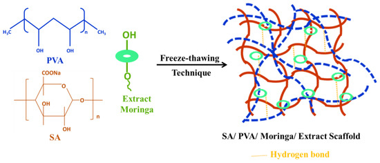 Studies have used SA/PVA as a scaffold with and without synthetic material to enhance its activity [7,18,19]. PVA-loaded Moringa oleifera seed extract has been synthesized as a wound dressing material to help heal chronic wounds [20]. In another work, PVA-loaded Moringa oleifera leaf extract with graphene oxide hydrogel was developed as a wound dressing by Ningrum et al. for wound dressing [21]. Additionally, SA/PVA/chitosan hydrogel with Ag2O/SiO2 and Calendula officinalis flower extract have been fabricated as a novel and green wound dressing [22].
