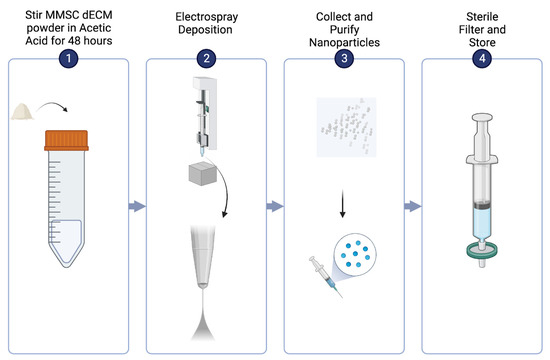 - Link, P.A.; Ritchie, A.M.; Cotman, G.M.; Valentine, M.S.; Dereski, B.S.; Heise, R.L. Electrosprayed extracellular matrix nanoparticles induce a pro-regenerative cell response. J. Tissue Eng. Regen. Med. 2018, 12, 2331–2336. [Google Scholar] [CrossRef] [PubMed]