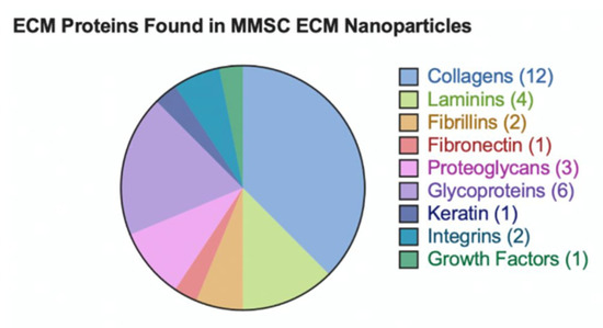 The mass spectrometry results confirmed that both the MMSC ECM nanoparticles contained important structural ECM proteins and potential proteins and peptides that contribute to their bioactivity. The nanoparticles had the greatest percentage of proteins from the cytoplasm and then membrane-associated proteins (Figure 2). Scaffold 5 determined that 160 proteins from the total proteasome were from the ECM region in the MMSC ECM nanoparticles. Collagens, laminins, fibronectin, proteoglycans, glycoproteins, growth factors, integrins, keratin, and fibrillins were all predicted to be in the MMSC ECM nanoparticles as seen in (Figure 3).
