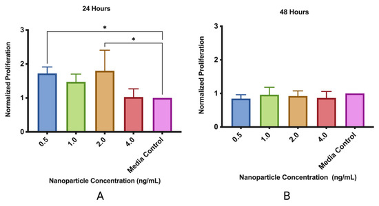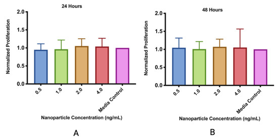 To evaluate the cytotoxic effects of the nanoparticles, cells were seeded at a density of 10,000 per well and grown in a 96-well plate (Falcon, Thermofisher, Grand Island, NY USA) for 48 h. Media were then replaced with nanoparticle treatments with concentrations of 0.5 ng/mL, 1.0 ng/mL, 2.0 ng/mL, and 4.0 ng/mL, or replenished with new media as the control. Treatments were added for 24 h and then the procedure from the MTT assay was conducted (Roche, Basel, Switzerland).