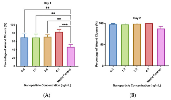 Scratch assay results. Fibroblasts supplemented with MMSC ECM nanoparticles have a faster wound closure rate compared to the media control. (A) Fibroblast growth rate after 24 h with nanoparticle media. (B) Fibroblast growth rate after 48 h with nanoparticle media. The data displayed are the mean ± standard deviation. ** indicates p < 0.001, *** indicates p < 0.0001, N = 3.