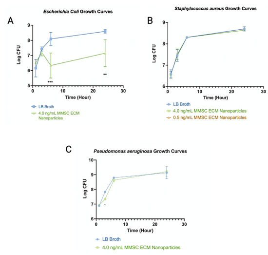 MMSC ECM nanoparticles were able to inhibit the growth of gram-negative E. coli and P. aeruginosa wild-type strains (Figure 10). MMSC ECM nanoparticles inhibited growth at a concentration of 4.0 ng/mL. Nanoparticles significantly reduced bacterial growth of E. coli after 6 and 24 h of culture incubation. It was found that S. aureus growth was not significantly reduced when the MMSC ECM nanoparticles were added to the culture. MMSC ECM nanoparticles significantly reduced P. aeruginosa growth at 3 h.