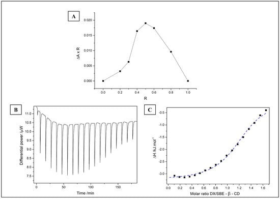 The complex formed in pH 5.0 due to DX stability and its zwitterion form at this pH. The zwitterion may interact electrostatically with anionic cyclodextrin molecules and engage in hydrophobic interactions. The stoichiometry of the complexes was evaluated by the continuous variation method (Job’s plot, Figure 1A). The maximum change in absorbance (ΔA × R) was observed at R = 0.5, which suggests the 1:1 stoichiometry []. The same proportion was reported for DX complexes with β-CD and γ-CD []. However, it is important to note that Job’s plot is a preliminary method that cannot be used solely to determine inclusion complex ratios [].