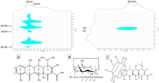 Top: contour plot of the 2D-NOESY spectra of DX/SBE-β-CD inclusion complex. DX: doxycycline. CD: sulfobutylether-β-cyclodextrin (SBE-β-CD). Bottom: (A) Molecular structure of doxycycline. (B) Molecular structure of SBE-β-CD. (C) Proposed geometric arrangement for the DX/SBE-β-CD inclusion complex.