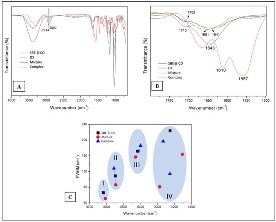 Infrared spectra from 4000 to 650 cm−1 (A) and 1800 to 1500 cm−1 (B) of samples of doxycycline (DX), sulfobutylether-β-cyclodextrin (SBE-β-CD), physical mixture, and freeze-dried complex (1:4 molar ratio). (C) Full width at half medium (FWHM) as a function of wavenumber in the range of 3700–3100 cm−1 of the samples. The shadow area is related to regions (I, II, III, IV) with a maximum wavenumber.