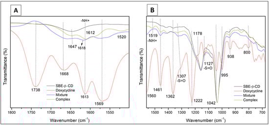 Infrared spectra from 1800 to 1500 cm−1 (A) and 1560 to 700 cm−1 (B) of samples of doxycycline (DX), sulfobutylether-β-cyclodextrin (SBE-β-CD), physical mixture, and freeze-dried complex (1:1 molar ratio).