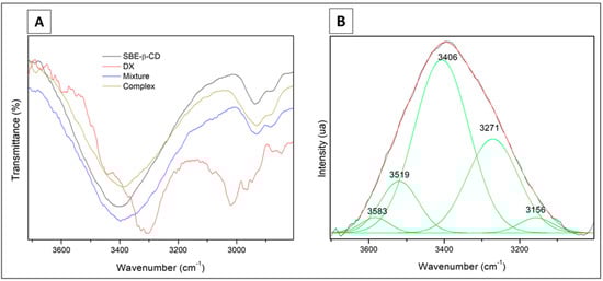 The analysis was carried out in a preliminary way using a 1:4 molar ratio (DX/SBE-β-CD) for complex and physical mixture. The spectra (Figure 3A) presented bands in all the samples at 2934 cm−1 and 2880 cm−1, related to stretching mode C-H (spectral assignments in Table S5).