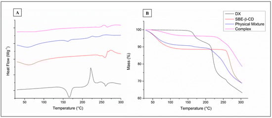 The TGA curves demonstrate that thermal degradation occurred at higher temperatures for the inclusion complex, which indicates a higher resistance to heat treatment. Since previous studies showed that DX powder, tablets, and pulverized tablets of DX degraded in accelerated conditions (40 °C and 75% of humidity for 3 months), the inclusion complexes studied here can be used in solid formulations to improve the drug thermal stability [].