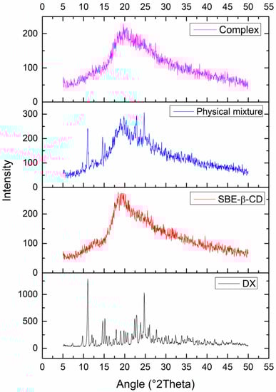 This assay was performed to investigate the physical form (crystalline or amorphous) of the drug, cyclodextrin, physical mixture, and complex (Figure 7). XRD can also be used to indicate the formation of inclusion complexes, since complexation leads to drug amorphization and consequent decrease or absence of crystalline peaks in the diffractogram. The DX diffractogram shows characteristic sharp peaks (2θ: 11.06, 14.65, 15.16, 22.44, 22.94, 24.78) that are present in the physical mixture at minor intensities due to drug dilution with cyclodextrin. As expected, the diffractogram of the complex showed a drastic reduction in the crystallinity index, suggesting the formation of an inclusion complex and corroborating with previous tests.