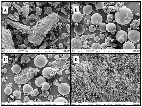 SEM analysis was performed to evaluate the morphology of the DX/SBE-β-CD inclusion complex. DX (Figure 8A) appeared as a monoclinic crystal system [], whereas SBE-β-CD (Figure 8B) exhibited spherical particles. In the physical mixture sample (Figure 8C), a blend of DX crystals and SBE-β-CD particles can be visualized. Lastly, the inclusion complex (Figure 8D) presented an irregular form and porous aspect (due to the freeze-drying process), which was quite different from raw materials of pure compounds, suggesting the formation of an inclusion complex.