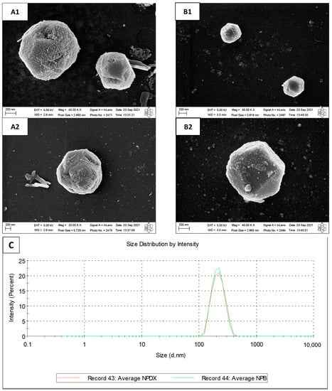 Scanning electron microscopy of (A1,A2) empty nanoparticles and (B1,B2) doxycycline-loaded nanoparticles. (C) Particle size distribution by percentage of intensity for empty nanoparticles (NPB) and doxycycline-loaded nanoparticles (NPDX).