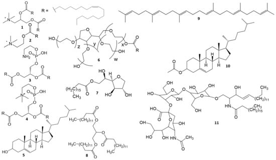 Structural formulas of the LNP and cLNP components. Cationic lipids: 1, dioleoyltrimethylaminopropane (DOTAP); 2, oleoylcholine (Ol-Ch). Structural lipids: 3, dioleoylphosphatidylethanolamine (DOPE); 4, dioleoylphosphatidylcholine (DOPC); 5, cholesterol (Ch). Additional components: 6, stearoylmonosorbitan (SPAN60); 7, polyethylene glycol sorbitan monooleate (polysorbate 80 (PS80)), w + x + y = 20. Core lipids: 8, coconut oil triglycerides (COTs); 9, squalene (Sq); 10, cholesterol acetate (ChA). Functional lipids: 11, GM3 ganglioside (GM3).