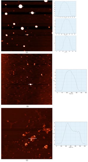 The lipoplex samples consisted of two types of particles: the original LNPs (Figure 2b) and particles with mRNA (Figure 2c). Figure 2c shows that the lipoplexes with mRNA were irregular in shape. The particle profile (representative object) had many local maxima, and the half-width was 180 nm. Since the half-height of the object (1.8 nm) did not exceed the bilayer thickness, the formation of a sandwich structure can be ruled out.