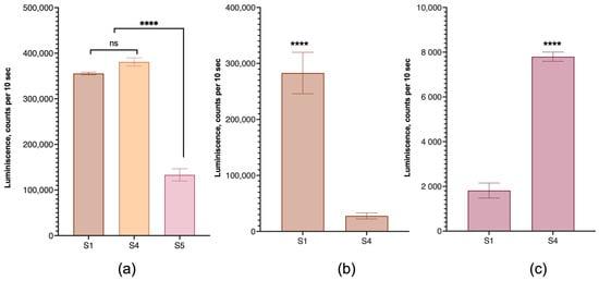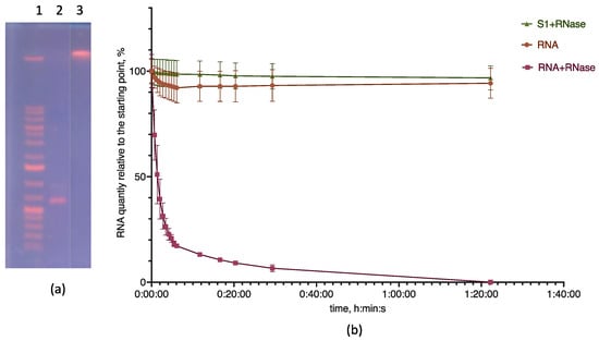 We controlled the completeness of mRNA inclusion using electrophoresis. There were no bands of free mRNA on the lipoplex electropherogram (Figure 3a). We also checked the absence of free mRNA in a solution of mRNA and LNP S1 lipoplexes prepared in water using the action of RNase A. As a rule, the formation of a complex of RNA with nanoparticles leads to its inaccessibility for the action of enzymes in solution if the incorporation of the nucleic acid is complete. On the contrary, if mRNA remains outside the complex with LNPs, it undergoes hydrolysis.