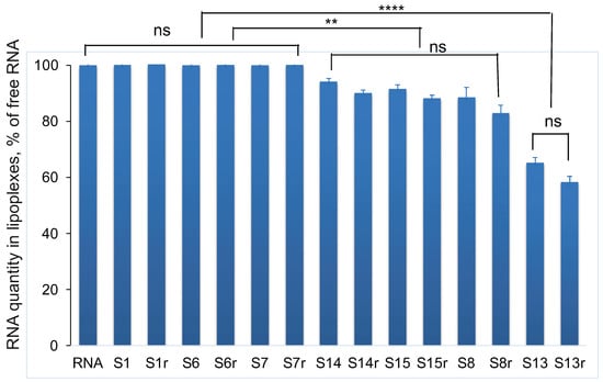 Quantity of RNA (relative to free RNA control, %) calculated from the average fluorescence intensity of SYBR Green I during the incubation of lipoplex samples for 30 min. Incubation of samples with RNase (index r) and without enzyme (no index); all samples were prepared in water. See Table 1 for LNP composition, mean ± SE. **, A statistically significant difference, p < 0.001; ****, a statistically significant difference, p < 0.0001; ns, not significant.