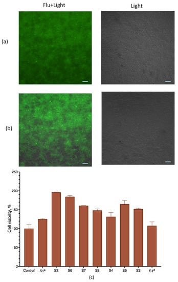 Viability assessment of HEK 293T cells. Microscopy of lipoplexes prepared from LNP (sample S1), labelled with BODIPY-C3 dye (S1Flu + mRNA, (a)) and BODIPY-C3 labelled LNPs (S1Flu, (b)); incubation time of 24 h and scale bar of 100 nm. Light, brightfield channel, Flu + Light, pseudocolor combined image, gray, brightfield channel; green, green fluorescence, (c) MTT test of HEK 293T cells after incubation with lipoplexes prepared from LNP samples for 24 h. See Table 1 for LNP composition; control—HEK 293T cells without particles, n = 3.