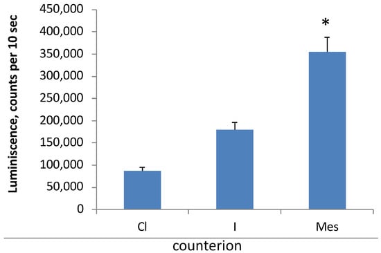 The search for the optimal composition of LNPs showed that the counterion of the cationic lipid affected the efficiency of cell transfection. Using DOTAP as an example, we investigated the effect of anion type on the efficiency of the transfection of HEK 293T cells. To this end, we synthesized DOTAP iodide and mesylate and used commercially available DOTAP chloride. The highest yield of luciferase was observed when DOTAP mesylate was applied as a cationic lipid; meanwhile, DOTAP chloride was the least effective in delivering nucleic acids to cells, and DOTAP iodide demonstrated an intermediate transfection efficiency (Figure 6). Subsequently, most of the other experiments were performed using DOTAP mesylate.