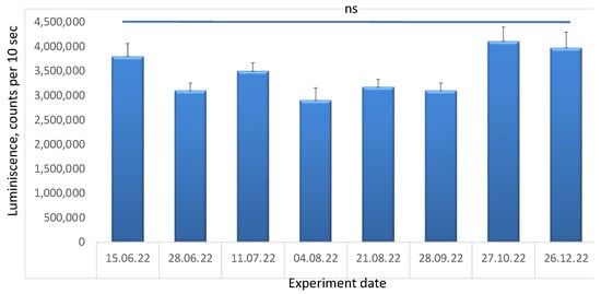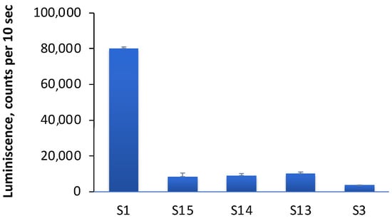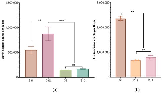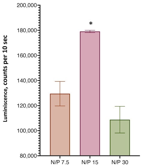 To measure transfection, after 24, 48, or 72 h, 1 µL was taken from each well and placed into a black 384-well plate, after which 5 µL of a working solution for measuring luciferase activity (Promega) was added, mixed on a shaker for 5 s at a speed 300 rpm, and incubated in the dark for 5 min, after which the luminescence was measured using an IR Cutoff filter with a signal accumulation time of 10 s using a Hidex Sense Beta Plus microplate reader (Hidex, Turku, Finland).