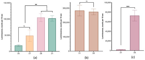 First, we determined the optimal conditions for the formation of lipoplexes during the interaction of mRNA with LNPs. Nanoparticles were used in the base composition (sample S1). The time of incubation of LNPs with mRNA had only a slight effect on the efficiency of the transfection of HEK 293T cells with lipoplexes, but the maximum effect was observed when incubated with mRNA for 40 min (Supplementary Figure S2a). Subsequently, this incubation time was used in all experiments. We noted no significant differences in transfection efficiency with lipoplexes prepared at 26 °C or 32 °C; however, lowering the preparation temperature to 8 °C significantly reduced the amount of synthesized luciferase (Supplementary Figure S2b).