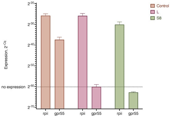 Total RNA was isolated using a Total RNA Purification Kit (Jena Biosciences, Jena, Germany) according to the manufacturer’s protocol. Residual genomic DNA was removed with DNase I (Thermo Fisher Scientific) according to the manufacturer’s protocol. For one RNA sample, 1 U of the enzyme was used. cDNA was synthesized using an MMLV reverse transcription kit (Evrogen, Moscow, Russia) with an oligo-dT primer. PCR was performed using an HS-Sybr Master Mix (Evrogen, Moscow, Russia), and the program was as follows: initial denaturation at 95 °C for a 3 min cycle, denaturation at 95 °C for 30 s, annealing at 57 °C for 30 s, DNA synthesis at 72 °C for 30 s for 35 cycles, and fluorescence detection at the end of each cycle. Amplification and detection were performed using a CFX-96 Touch apparatus (Bio-Rad Laboratories, Hercules, CA, USA). Primers were generated using the ITDNA PrimerQuest service (https://eu.idtdna.com/PrimerQuest (accessed on 7 February, 2023)) and validated using the NCBI Primer-BLAST service []. Their sequences were as follows: GPR55 direct 5′-ACTGATGTGCTTCCCTTTGAT-3′, reverse 5′-CCTGAACACTGGGTTATAAG-3′, POLR2A direct 5′-CCCAGCTCCGTT-GTACATAAA-3′, and reverse 5′-TCTAACAGCACAAGTGGAGAAC-3′. Reaction mixtures without reverse transcriptase and a cDNA template were used as negative controls.