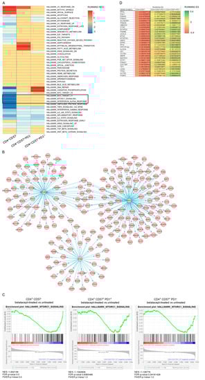 Transcriptomic analysis of the effect of belatacept on CD4+CD57−, CD4+CD57+PD1− and CD4+CD57+PD1+ allogeneic T cells after 6 h of culture with activated dendritic cells. (A) Heatmap of normalized enrichment score (NES) of untreated versus belatacept-treated CD4 subpopulations analyzed by gene-set enrichment analysis (GSEA). (B) Network representation of gene sets MYC target V1, mTORC1 signaling and IFN alpha response profiles of untreated CD4+CD57− versus belatacept-treated. (C) mTORC1 signaling enrichment plot for CD4+CD57−, CD4+CD57+PD1+ and CD4+CD57+PD1−cells activated in the presence and absence of belatacept. Normalized enrichment score (NES), false discovery rate (FDR-q value) and family-wise error rate (FWER p-value) of the hallmark mTORC1 signaling gene set for the various CD4+ populations, in the presence and absence of belatacept. Belatacept significantly impaired the transcription of mTORC1 pathway genes only in CD4+CD57− cells. (D) Heatmap of the first 30 genes of the leading-edge subset of the mTORC1 signaling enrichment plot ranked for CD4+CD57− cells untreated versus belatacept-treated. The leading-edge subset is the core of the gene set accounting for the enrichment signal. Enrichment score at the position in the ranked list of genes (RUNNING ES) of CD4+CD57+PD1+ and CD4+CD57+PD1− have been ordered as a CD4+CD57− list and plotted on the heat map allowing comparisons.