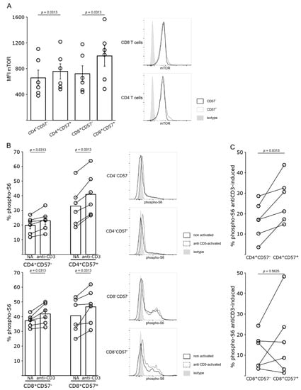 To assess the expression of mTOR in the different subsets of CD4+ cells, mTOR expression was determined by flow cytometry. mTOR was slightly increased in CD4+CD57+ and CD8+ CD57+ positive cells as compared to CD4+CD57− and CD8+CD57− cells, respectively (p < 0.04) (Figure 3A). In addition, the activation of the mTORC1 pathway was evaluated through the determination of the phosphorylation of S6 ribosomal protein which is activated downstream mTORC1. At baseline, activation of S6 ribosomal protein in CD4+CD57+ T cells was slightly, but not significantly, higher than in CD4+CD57− cells (p < 0.08) (Figure 3B). The basal level of CD8 activation was similar in CD8 subsets (Figure 3B). When activated through CD3 engagement, all CD4 and CD8 subsets exhibited a higher expression of phospho-S6. However, a significantly higher upregulation of phospho-S6 was observed in CD4+CD57+ cells as compared to CD4+CD57− cells highlighting the implication of this pathway in CD4+CD57+ cells.