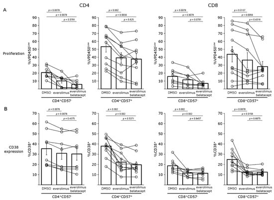 Activation and proliferation of CD4+CD57−, CD4+CD57+, CD8+CD57− and CD8+CD57+ T cells in the presence of mTOR inhibitor: (A) Proliferation and (B) CD38 expression of CD4+CD57−, CD4+CD57+, CD8+CD57− and CD8+CD57+ T cells after 5 days of culture with allogeneic aDCs without (DMSO) or with everolimus, or everolimus + belatacept. Eight (CD57−) or ten (CD57+) independent experiments (pictograms) were performed, and the mean (bar chart) and SEM are shown.