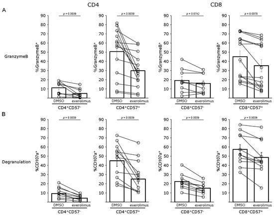 Granzyme B expression and cytotoxicity in CD4+CD57−, CD4+CD57+, CD8+CD57− and CD8+CD57+ T cells treated with mTOR inhibitor: (A) Expression of granzyme B and (B) CD107a by CD4+CD57−, CD4+CD57+, CD8+CD57− and CD8+CD57+ T cells after 5 days of culture with allogeneic aDCs without (DMSO) or with everolimus, followed by incubation with target cells for 4 h. Nine (CD57−) and 14 (CD57+) (A) or 9 (CD57−) and 11 (CD57+) (B) independent experiments (pictograms) were performed. The mean (bar chart) and SEM are shown.