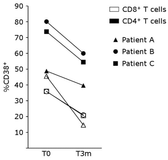 CD38 expression on CD4+ or CD8+ T cells from patients treated with belatacept, before (T0) or 3 months after (T3m) the introduction of everolimus (n = 3 patients).